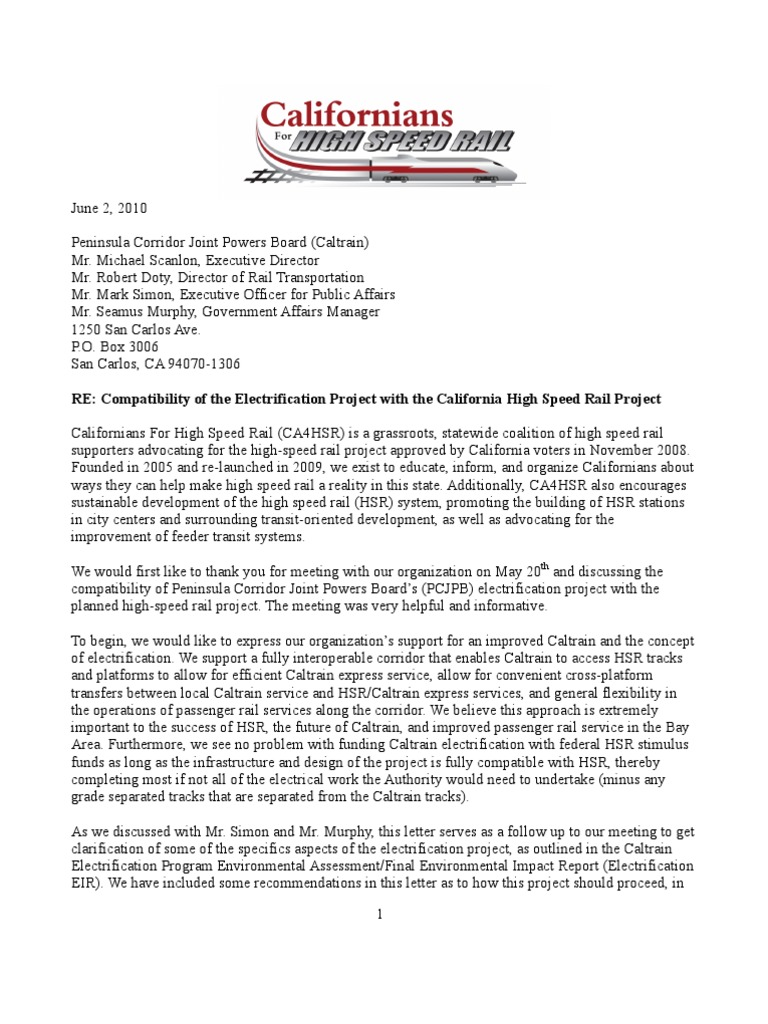 CA4HSR Letter to Caltrain - Request for Clarification Re ...